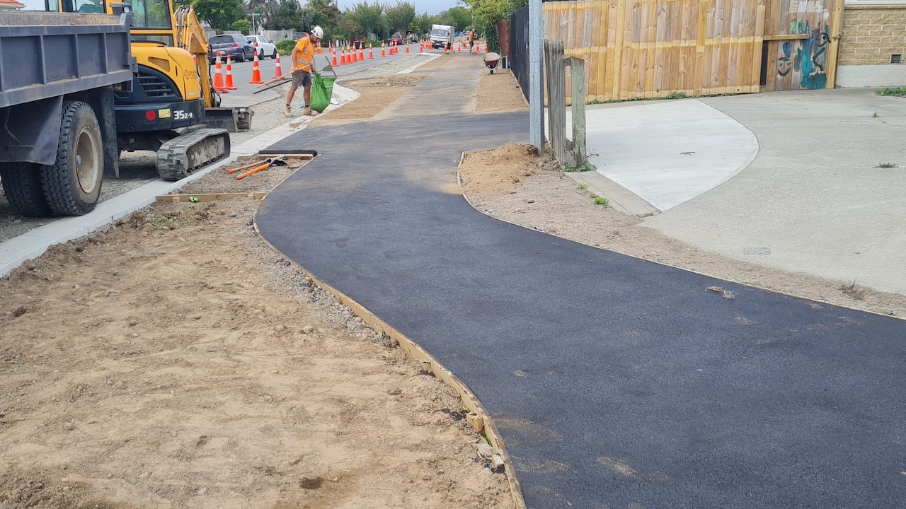 769m of new kerb and channel, 11,691m2 of AC footpath renewal, 1,392m2 of shoulder reinstatement, 140m2 of new AC footpath, 80m2 of berm construction, 115m2 of AC commercial entranceway reconstruction, 340m of 180mm PE water pipe and connections.